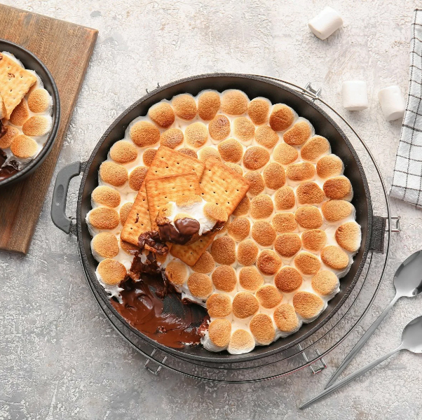 Вы можете выложить шоколад на дно формы, как показано в наших видео, сверху плотно накрыть его маршмеллоу и запекать в духовке прямо в форме. Подавать такой Смор нужно с печеньем, которым очень удобно и вкусно есть этот замечательный десерт!