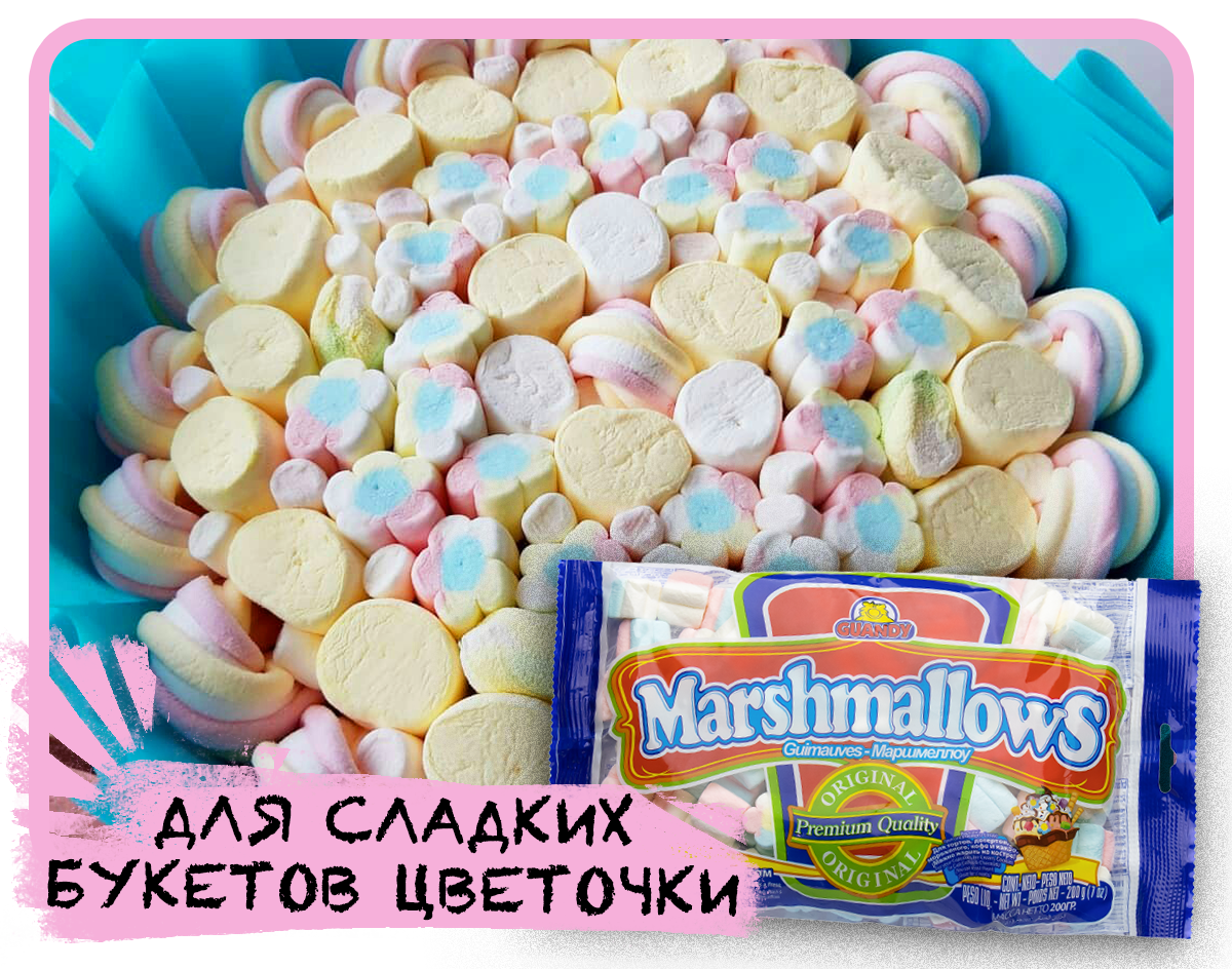 Только у нас можно заказать и купить оптом шоколадный маршмеллоу и маршмеллоу цветочки. Все виды нашего маршмеллоу идеально подходят, чтобы украшать маршмеллоу десерты, делать из маршмеллоу букеты, готовить из маршмеллоу мастику, надевать маршмеллоу на палочки.